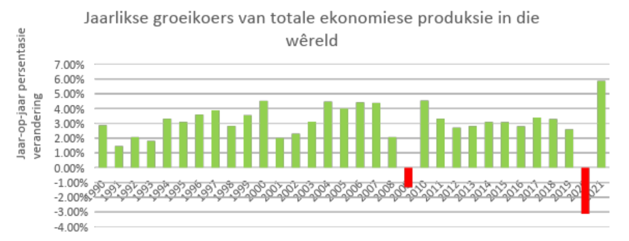 Die grafiek hieronder dui aan wat oor die jare gebeur het met die verandering in globale ekonomiese produksie sedert 1990. Rooi kolomme dui aan wanneer daar globale resessies was: in 2009 en in 2020. In 2009 was dit as gevolg van die bankwesekrisis wat ontstaan het in die VSA en versprei het na die res van die wêreld. Dit het veroorsaak dat minder geld vir investering beskikbaar was, wat gelei het na laer produksie. In 2020 het regerings regoor die wêreld ‘n beleid van fisiese inperking geïmplementeer om die verspreiding van Covid-19 te beperk. Die inperkings het verhoed dat mense werk toe kon gaan om goedere te produseer en dienste te verskaf.