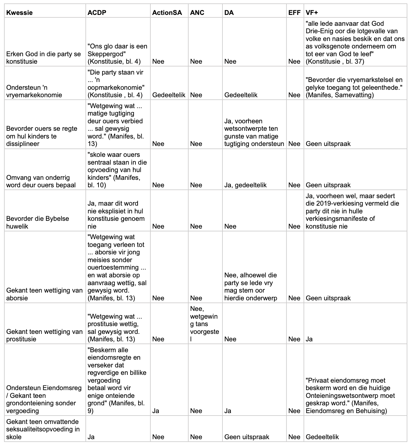 Die vraag is: is daar sulke partye? Elke party was al ten minste een keer in die nuus oor iets opspraakwekkend. Dit is immers ons geneigheid as sondige mense om foute te maak. As ons egter holisties na elke party se beleid volgens Christelike waardes kyk, gee dit ons wel ‘n goeie idee van watter partye waardig is om voor te stem: